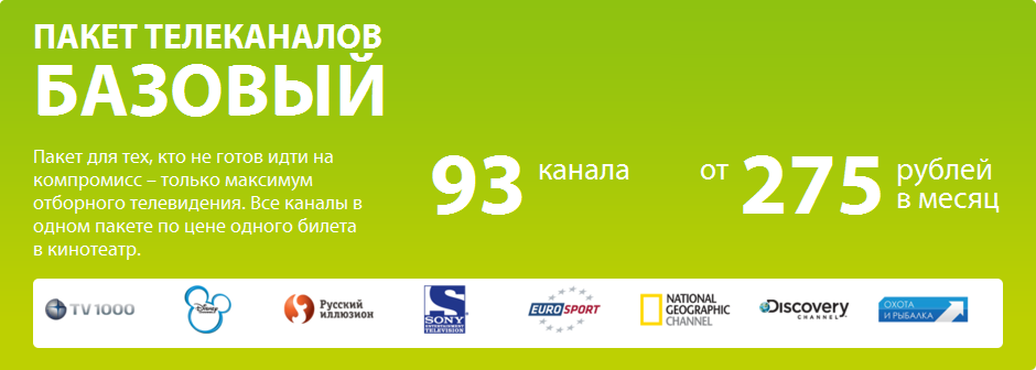 Основной пакет для подключения ― «Базовый». Это 18 новостных каналов, 16 — кино и сериалы, 31 познавательный и развлекательный канал, 9 спортивных, 13 детских, 12 музыкальных, 30 каналов HD: